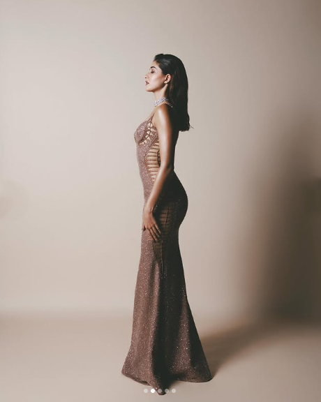 Ananya Panday ने इस पीच कलर की लॉन्ग ड्रेस को पहन एक से बढ़कर एक पोज दिए हैं। इस शिमरी ड्रेस में अपर एरिया में कट-आउट डिजाइन है और वही डिजाइन गाउन के साइड एरिया में भी है। जिससे अनन्या का ग्लैमरस फिगर नजर आ रहा है। उन्होंने इस गाउन के साथ बेस मेकअप और खुले बाल रखे हैं। अनन्या ने स्ट्रेपी गाउन के साथ एक चोकर स्टाइल नेक पीस पहना है।