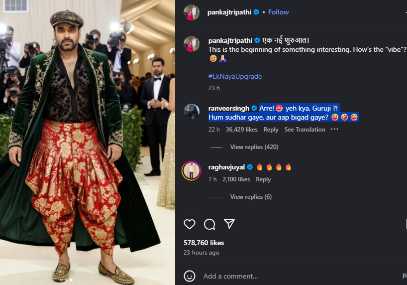 उनके द्वारा शेयर की गई तस्वीरों में वो शीर शर्ट के साथ ग्रीन वैलवेट की ओवर कोट पहने दिखे हैं, साथ में उन्होंने रेड और गोल्डन कलर की थोती पैंट पहनी है। पंकज साथ में बैगी कैप पहने दिखे। तस्वीरों को शेयर करते हुए उन्होंने लिखा, एक नई शुरुआत, ये कुछ बहुत ही रोचक चीज की शुरुआत है। कैसी लगी वाइब। उनके इस अंदाज को देख फैन्स के साथ-साथ बॉलीवुड के भी होश उड़ गए। पंकज त्रिपाठी की तस्वीरें इंटरनेट पर तेजी से वायरल हो रही हैं। उनका ये अंदाज सबके बीच चर्चा का विषय बन गया है।